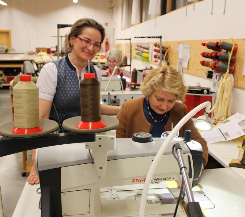 Zahlreiche Vereine zählen zu ihren treuen Kunden, erzählte Maria Freund beim Rundgang durch den Betrieb. Die Vereine können hier vom Hut bis zum Schuh eingekleidet werden und auf Wunsch die eigenen Vereinswappen erhalten. Ergänzend zu den hochwertigen und nach Maß gefertigten Lederhosen gibt es in ihrem umfangreichen Sortiment bekannte Trachtenmarken von Dirndln über Blusen, Jacken, Westen, Hemden und Hosen bis hin zu passenden Accessoires.
