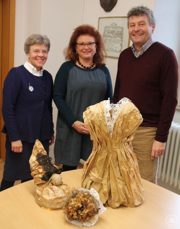 Dritte Bürgermeisterin Erika Träger nahm dieser Tage die Papierskulptur „Goldhaubenträgerin“ der Künstlerin Regine Staudt in Empfang.