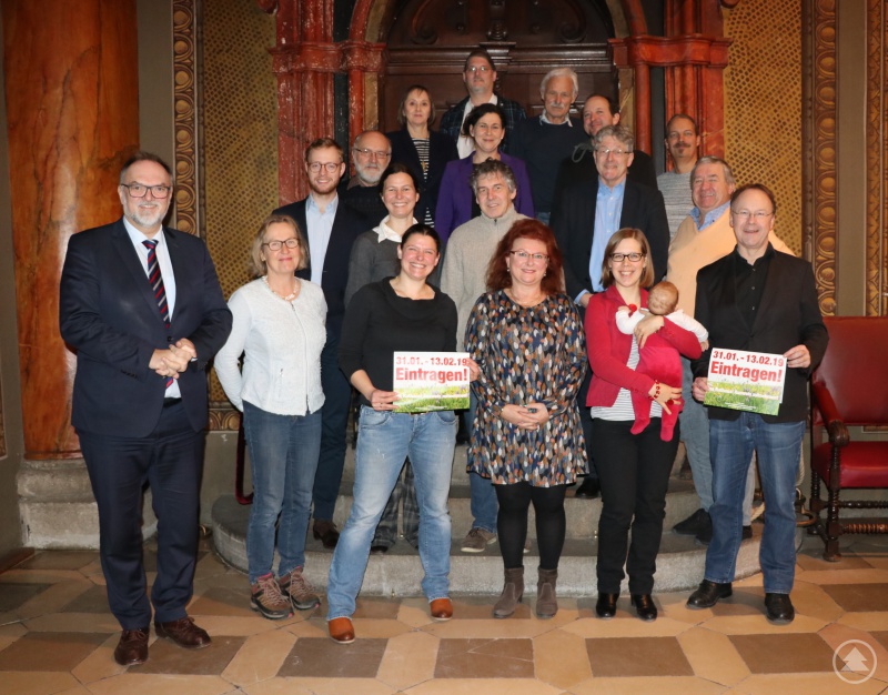 Oberbürgermeister Jürgen Dupper (li. außen), Agnes Becker - Landesbeauftragte des Volksbegehrens (3.v.l.), Dritte Bürgermeisterin Erika Träger (4.v.l.) sowie Urban Mangold (r. außen) – Zweiter Bürgermeister und ÖDP-Bezirksvorsitzender mit den Mitgliedern des lokalen Aktionsbündnisses zum Volksbegehren „Rettet die Bienen!“