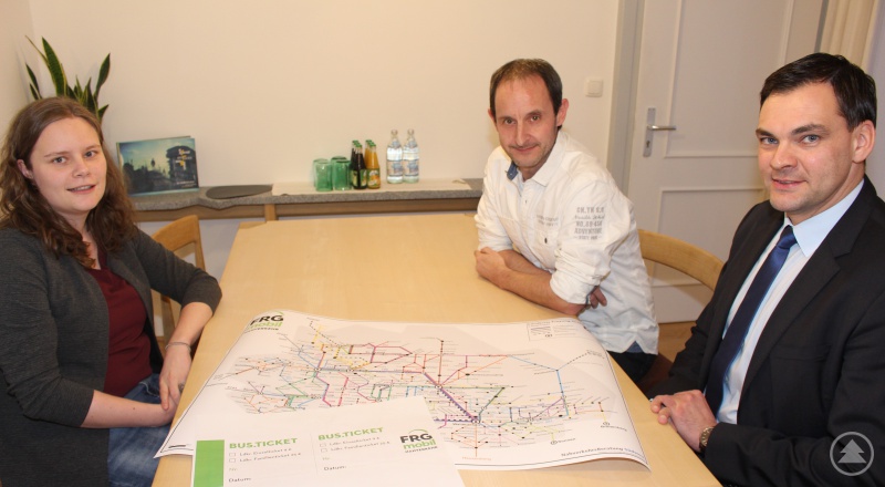 Freuen sich das neue Landkreistagesticket präsentieren zu dürfen (von links): Katharina Frieg von der Mobilitätszentrale, ÖPNV-Verantwortlicher Michael Atzinger und Landrat Sebastian Gruber. Mit dem neuen Ticket kann man für einmalig neun Euro einen Tag lang auf 51 Linien quer durch den Landkreis fahren.