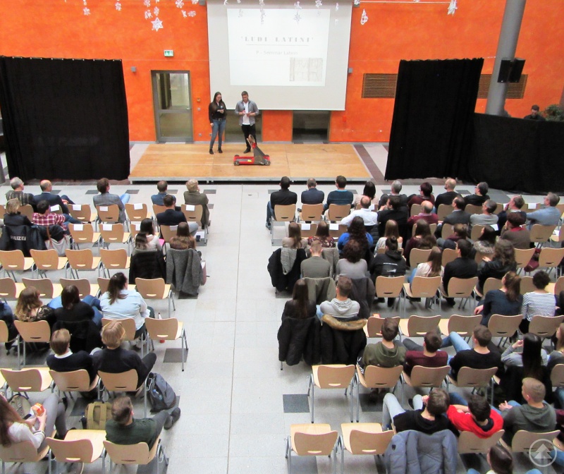Die Schülerinnen und Schüler im P-Seminar Latein von Georg Kalleder veranstalten am Gymnasium Freyung einen „Lateintag“, der die eingeladenen Grundschüler für die lateinische Sprache und die römische Geschichte begeistern sollte. Marcel König führte das Katapult vor, das er sich für die Kinder ausgedacht hatte und das für diese ein Highlight gewesen war. Anna-Lena Madl zeigte Bilder von dem Tag und den Stationen, die die Kinder durchlaufen hatten. Sie durften z. B. den Brand von Rom löschen oder Fladenbrot mit Olivenöl probieren.