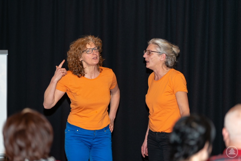 Gehrs Performance ist viel eher Kleinkunst als Kabarett. Nach dem ausgestellten Bühnenaufbau mit Tisch, Stuhl, Wasserglas, drei Wäscheklammern, ein paar Bällen und einem Whiteboard folgte der quirlige Soundcheck. Das Publikum war angehalten, einen Gemeinplatz aus dem Kasperle-Theater zu reaktivieren: „Kinder, seid ihr alle da?“ Was Gehr nun aber anstimmte, war ein affirmatives oberpfälzisches „Dou!“ - und das im Kanon. Theaterpädagogin Petra Scholz hat das Programm gemeinsam mit der Künstlerin erarbeitet und trat nun als Regisseurin auf. Ihr oblag es, dem Aufführungskonzept Nachdruck zu verleihen: „Nein Gerti, im Plan steht nur ‚Begrüßung‘, nicht, dass du die Leute einzeln willkommen heißen sollst.“ Gewissenhaft stimmte die Mittvierzigerin zu. Man wolle ja schließlich alles richtig machen.