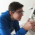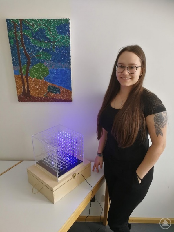 Noch künstlerischer ist die Idee von Anna-Lena Madl: Sie hat einen LED-Würfel konstruiert. Die darin verbauten Lämpchen können zwar nur blau leuchten. Aber das Muster mit dem Namen „Rain“, in welchem sie das tun, hat Anna-Lena programmiert – und das ohne bisherige Vorkenntnisse in Informatik. Als besonders knifflig empfand sie das Verlöten der einzelnen Lämpchen mit Silberdraht und das Herstellen einer Schablone, so dass alle Ebenen des Würfels identisch aufgebaut sind und gleichmäßige Effekte entstehen können. Um ihren optischen Ansprüchen Genüge zu leisten, hat Anna-Lena zudem eine Holzkiste zum Standfuß umgebaut und Bastlerglas für die Hülle zurechtgeschnitten.