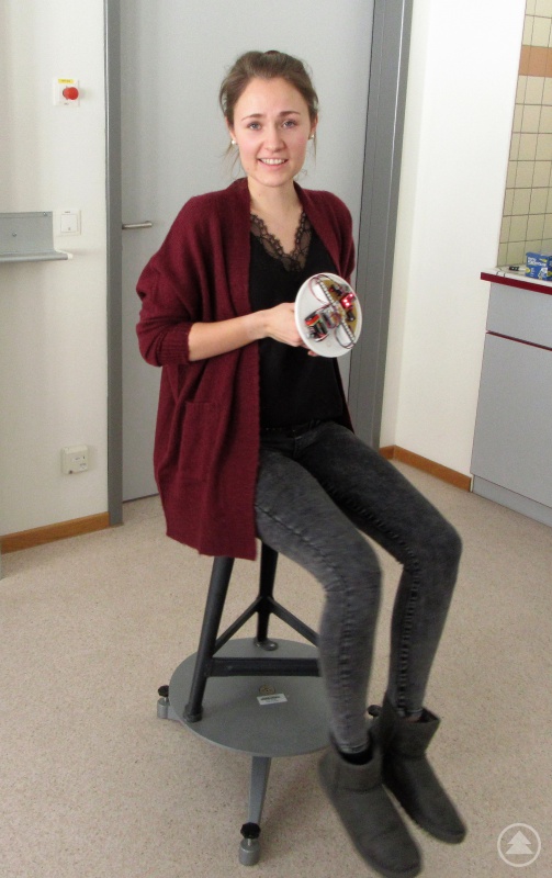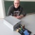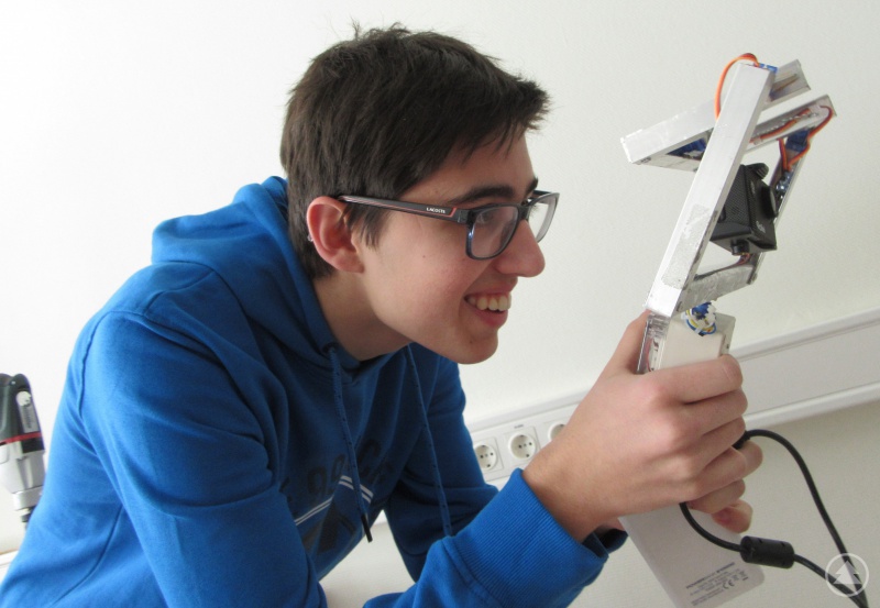 Ebenfalls ein fahrbares Gefährt entwickelte Sebastian Bloch. Sein Roboter bewegt sich auf lediglich einer Achse vorwärts und muss daher ständig sein Gleichgewicht neu ausbalancieren. Ein Drehsensor nimmt wahr, wie sehr die Räder sich neigen. Aus diesem Messwert errechnet eine Arduino genannte Plattform, um wie viel Grad eine Gegenbewegung notwendig ist, damit das Fahrzeug nicht umfällt. Sebastians Idee ist es, mit diesem Gefährt hohe Ladungen zu transportieren. Was beim Fortbewegungsmittel Segway der Mensch macht, soll hier automatisch das Fahrzeug selbst hinbekommen.