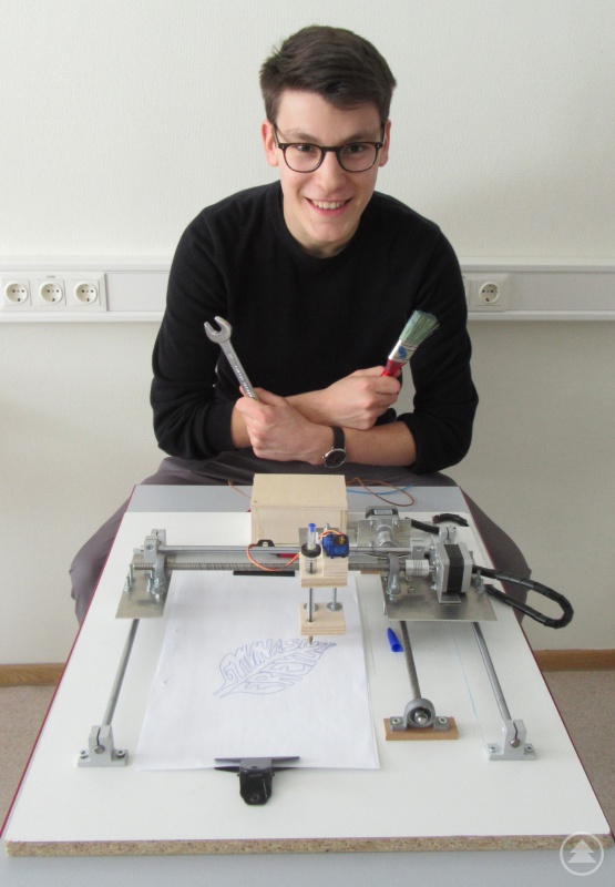 Eine sehr aufwändige Konstruktion ist die von Elias Lerchl. Als Vorlage dienten ihm gängige Verfahren bei CNC-Fräsen oder im 3D-Druck. Seine Zeichenmaschine vermag es nämlich, Graphiken, die ihr als digitale Informationen eingespeist werden, eigenständig aufs Papier zu bringen. Die Rechenleistung, die der von Elias programmierte Arduino dabei leisten muss, ist erheblich. Denn der muss die Zeichenarme gleich in drei Richtungen ansteuern: zwei Motoren für die x- und y-Achse und einen Servo-Motor für die z-Richtung, also die Höhe. Von vornherein muss auch eingestellt werden, wie groß die Zeichenfläche sein soll und mit welcher Geschwindigkeit gezeichnet wird.