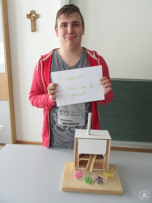 Aufgrund seiner Vorliebe für grüne Bonbons hat Lukas Bumberger eine Farbsortiermaschine gebaut. Diese immer mühsam aus der Packung heraussuchen zu müssen, das kann man sich mit seiner Erfindung sparen. Denn schüttet man einfach alle Bonbons oben in den Trichter, schafft es sein Gerät, die Farben pink, lila, gelb und natürlich grün voneinander zu unterscheiden und eben nach Farben getrennt unten wieder auszuspucken. Das Geheimnis sind ein im Gerät verbauter Farbsensor und ein damit verknüpfter Arduino, dem Lukas das Farbspektrum quasi beigebracht hat. Je nach Farbwert gibt der Arduino den Befehl zum Verstellen einer Rutsche im Innern – und das untersuchte Bonbon plumpst in die richtige Schale.