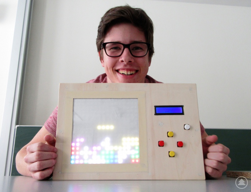 Auch ein auf den ersten Blick harmloser viereckiger Kasten ist die Entwicklung von Markus Meyerer. Doch die auf der Oberseite angebrachten Tasten und das Display verraten es: hier handelt es sich um ein großes Spielzeug! Markus hat nämlich das berühmte Spiel „Tetris“ im Großformat nachgebaut. Der Schüler schrieb einen Code, der nacheinander per Zufall Blöcke in acht verschiedenen Farben und Formen auf das Spielfeld rieseln lässt. Per Tastensteuerung entscheidet der Spieler, wo und in welcher Form der Stein unten abgelegt werden soll. Eine volle Reihe verschwindet vom Bildschirm und der Spieler erhält 100 Punkte. Ein kleines Display oberhalb der Tasten zeigt den aktuellen Punktestand und das Endergebnis an.