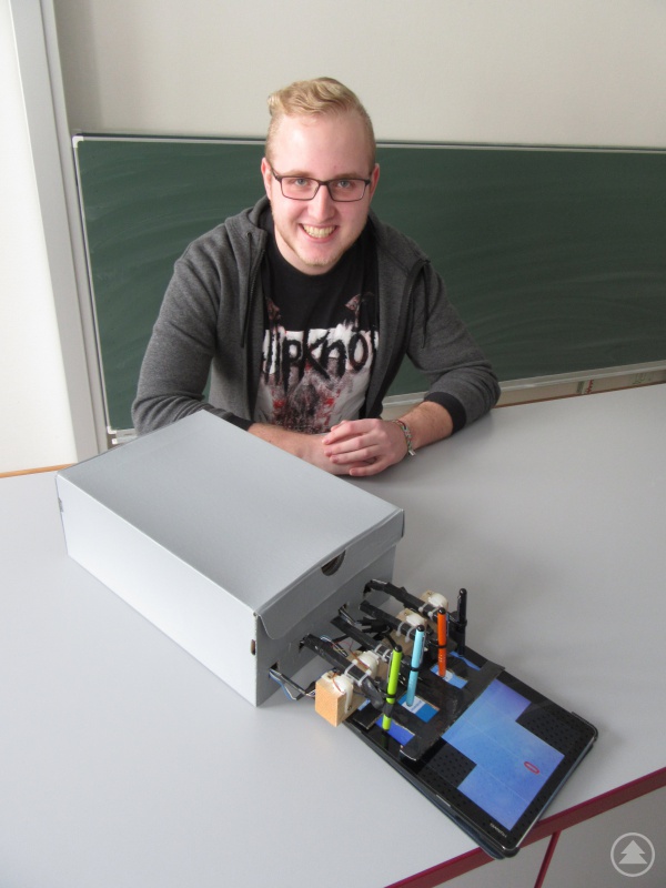 Matthias Reischl hat eine Art automatisch spielendes Klavier gebaut. Es besteht aus vier Touch-Stiften, an jedem hängt ein eigener Motor. Wann der Stift sich senken soll, weiß der Motor aufgrund der Programmierung, die Matthias vorgenommen hat: Erscheint auf dem Display des Tablets, das man unter den Automaten legt, eine schwarze Taste, bewegt sich der Stift nach unten, ansonsten bleibt er auf halber Höhe in seiner Ausgangsposition. Ein Sensor leitete die entsprechende Information an den verbauten Arduino weiter und dieser steuert wiederum die Motoren an. So kann man sich Melodien mit einem Tonumfang von bis zu vier Tönen vorspielen lassen, ohne selbst einen Finger rühren zu müssen!