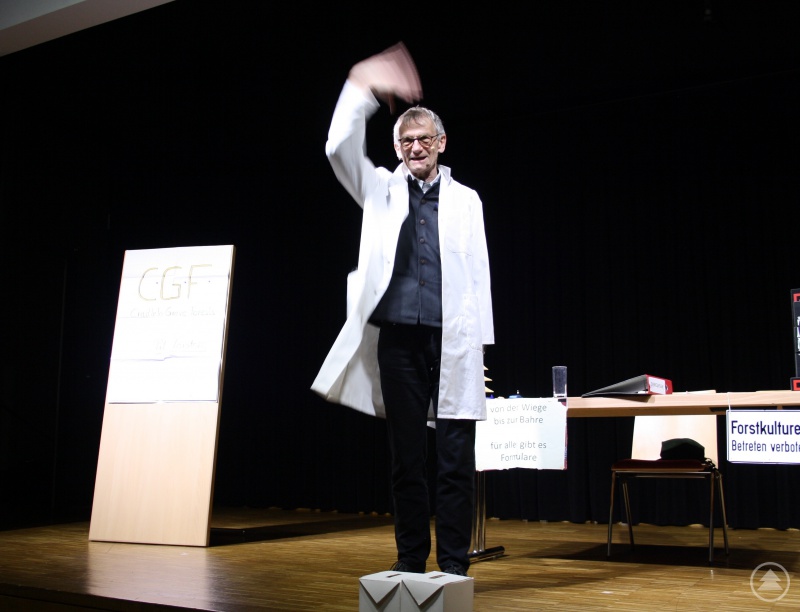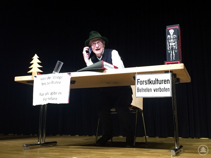 Hier schlüpfte Suda, als Inhaber des Lehrstuhls für Wald- und Umweltpolitik an der TU München nicht ganz unerfahren im Umgang mit der „Grünen Spezies“, in verschiedene Rollen: Nach dem Bestatter trat der schüchterne Geschichtsdozent auf. Er verfolgte den historisch gewachsenen Blick auf den Försterstand von „Ich kann hetzen, jagen / und kann Leute plagen“ bis zur Familienserie „Forsthaus Falkenau“. Sein Kollege, ein Soziologe, kam dann auf die divergenten Ansprüche aus Gesellschaft, Politik, Wirtschaft und Verbänden im Hier und Jetzt zu sprechen. Diese resultierten in dem Wortungebilde „ökonologische Schnutzfunktion”. Der Förster selbst, eisern dem „Gesetz des Örtlichen“ folgend, winkt hier nur ab: „Ich gehe in den Wald!“