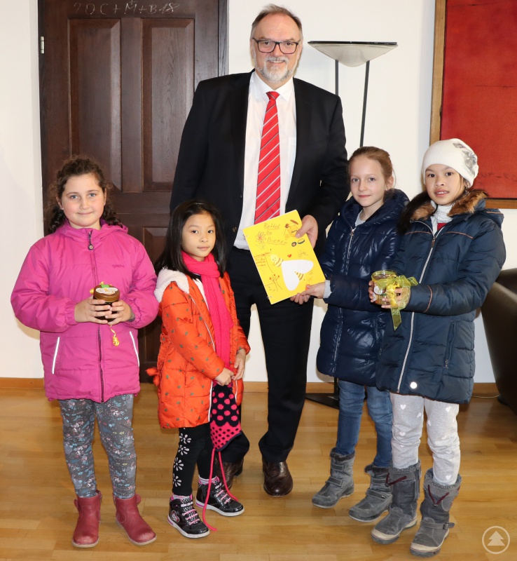 Helena (von links), Giang, Lili und Anja vom Städtischen Kinderhort übergeben stellvertretend die Unterschriftenliste und ein Glas mit echtem Imkerhonig an Oberbürgermeister Jürgen Dupper.