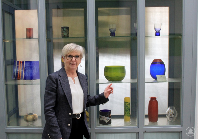 Die Verbundenheit zur Glasfachschule Zwiesel zeigt die Landrätin auch im Amt. Im Landratsamt Regen wird für die Arbeiten der Schule geworben.