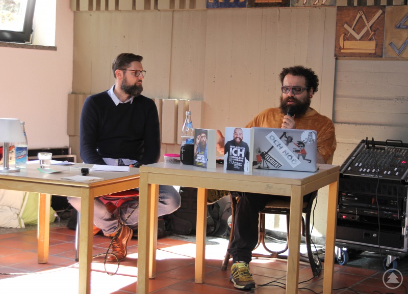 Jugendpfleger Dirk Reichel, der als Moderator fungierte, und Firat Alshater (re.) auf der Bühne in der Aula der Berufsschule Regen.