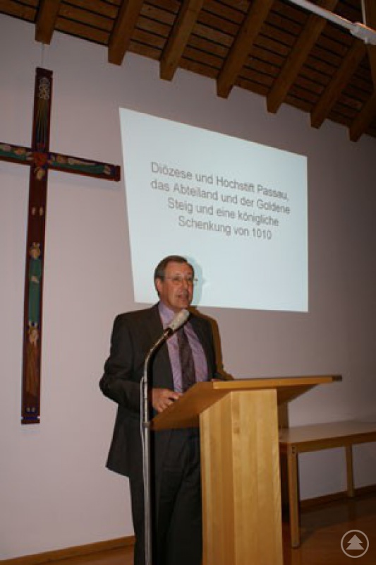 Professor Erkens ist einer Einladung des Heimat- und Museumsvereins Waldkirchen, der KEB Freyung-Grafenau und der Pfarrei Waldkirchen in das Waldkirchner Pfarrheim gefolgt. Er hielt einen Vortrag über das Thema „Diözese und Hochstift Passau, das Abteiland und der Goldene Steig und eine königliche Schenkung von 2010“. Der Referent, der ursprünglich aus Köln stammt, und in Passau auch in der Funktion als Leiter des „Instituts für Kulturraumforschung und Nachbarregionen“ seine wissenschaftlichen Arbeiten intensiviert, beschäftigt sich hauptsächlich mit mittelalterlichem Königtum, der Verbindung zwischen geistlicher und weltlicher Macht und ist deshalb auch ein anerkannter Fachmann für Stadt- und Bistumsgeschichte Passaus.