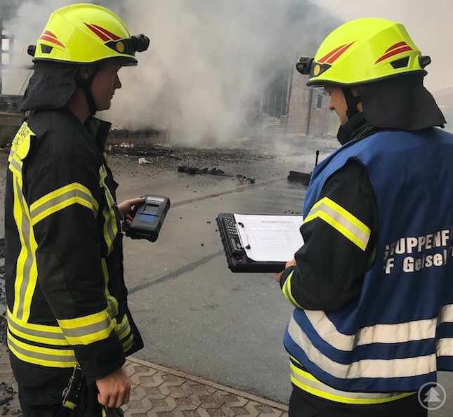 Feuerwehrler der FF Geiselhöring mit einem Mehrgasmessgerät.