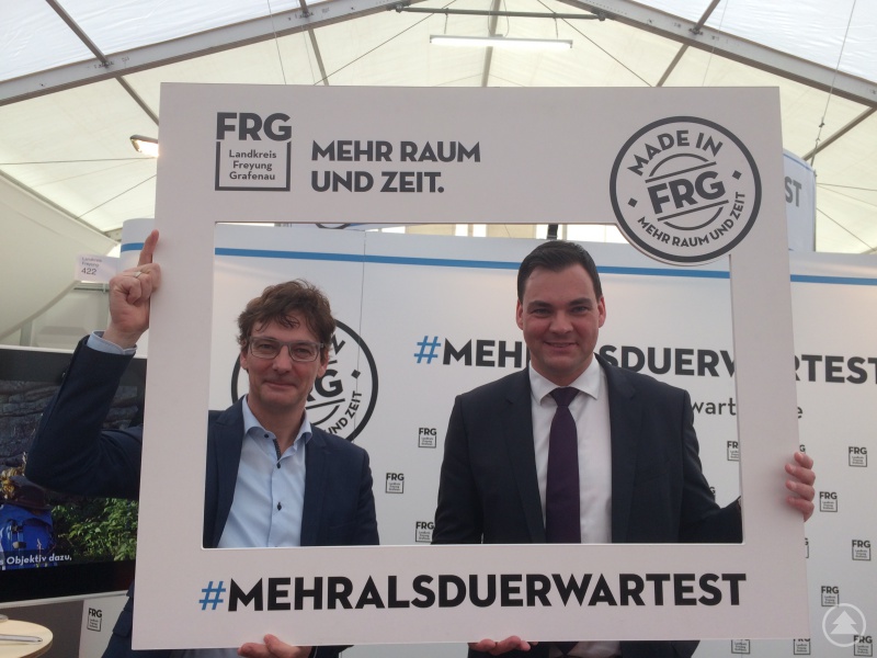 Landrat Sebastian Gruber (rechts) und Regionalmanager Stefan Schuster am „Mehr als du erwartest …“- Messestand im Rahmen eines Messeauftrittes.