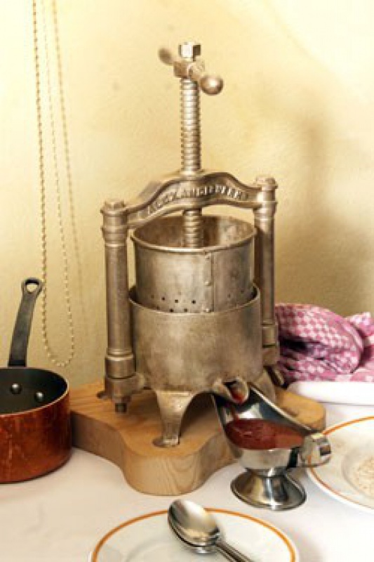 Josef Keilhofer, Patron des Restaurant-Cafe Fox und leidenschaftlicher Entdecker traditioneller und in Vergessenheit geratener Küchenrezepte, hat vor kurzem eine dieser Entenpressen erstanden und bietet seinen Gästen ab diesem Herbst erstmals den rar gewordenen Geflügel-Klassiker „Ente gepresst“ an. Das überlieferte Rezept „Caneton á la presse“ wurde im ausgehenden 19. Jahrhundert von einem Monsieur Mèchenet, Restaurantbetreiber in der Normandie, entwickelt und erlebte in den darauffolgenden Jahrzehnten einen Siegeszug durch die Küchen Italiens, Frankreichs, Schwedens und in den USA.  Die Karkassenpresse aus Messing oder Silber, sichtbar im Restaurant ausgestellt, diente einst als Aushängschild für die Qualität der Küche. Es ist wohl dem großen Aufwand bei der Zubereitung zuzuschreiben, dass dieses besonders schmackhafte Gericht wieder in Vergessenheit geriet und von den Speisekarten nach und nach verschwand. Seit den 80-er Jahren gibt es jedoch in der Normandie wieder einen Verein, der sich um den Erhalt dieser Tradition bemüht.  „Ente unter Druck“ ist heute ein seltener Gaumengenuss mit visuellem Erlebnischarakter, mit dem sich das Restaurant-Cafe Fox  im erlauchten Kreis der wenigen Topp-Restaurants befindet, die derzeit ebenfalls ihre Speisekarte mit diesem Kennergericht bereichern: La Tour d’Argent in Paris, Hotel Adlon in Berlin oder Otto Koch im Münchner Fernsehturm, um nur einige zu nennen.