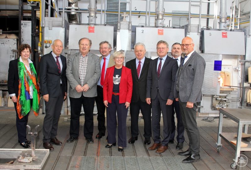 Die Hauptakteure vor dem Glasofen, v.li. Maria Sommerer (Sachgebietsleiterin Berufliche Schulen an der Regierung von Niederbayern), Ministerialdirigent German Denneborg, stellvertretender Schulleiter Erwin Donnerbauer, Schulleiter Hans Wudy, Landrätin Rita Röhrl, Dr. Robert Hartl (Vorsitzender Förderverein Glasfachschule Zwiesel), Bereichsleiter Josef Schätz (Regierung von Niederbayern), Ministerialrat Werner Lucha und MdL Manfred Eibl.