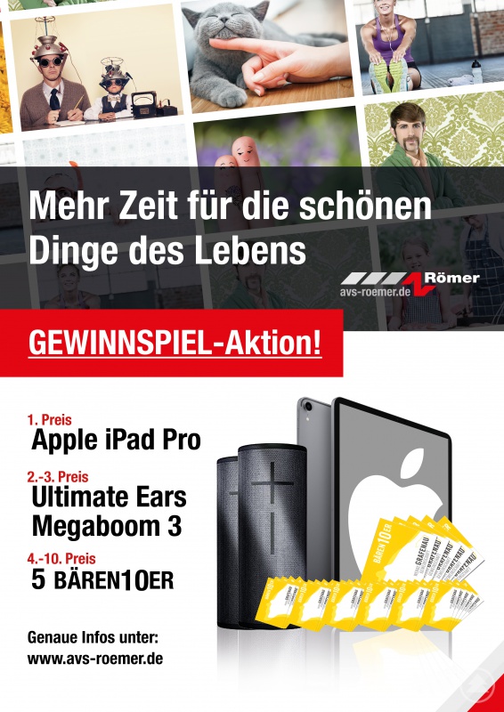 Zehn verschiedene Motive sollen zeigen, dass Menschen, die hier leben und arbeiten, mehr Zeit für die schönen Dinge des Lebens haben. Die unterschiedlichen Plakatmotive hängen an Standorten in Grafenau, Regen, Zwiesel und Passau im Zeitraum vom 26. April bis zum 27. Juni an jeweils zehn Tagen. Die Kampagne wird von einem Gewinnspiel begleitet. Die zehn Motive schmücken Postkarten, die in Geschäften, Restaurants und Tankstellen in Grafenau ausgelegt wurden. TeilnehmerInnen des Gewinnspiels sollen sich nun auf die Suche nach den zehn Postkartenmotiven machen. Wer alle zehn Motive gefunden hat, macht ein Bild davon und lädt es unter dem Gewinnspiel-Facebook-Post von AVS Römer hoch. Während der Gewinnspielaktion werden immer wieder Tipps bei Facebook veröffentlicht, wo die Postkarten in Grafenau zu finden sind. Das Gewinnspiel läuft bis zum 03. Juli. Zu gewinnen gibt es als Hauptpreis ein Apple iPad Pro, als zweiten und dritten Preis Ultimate Ears Megaboom 3 sowie als vierten bis zehnten Preis sieben Gutscheine im Wert von 50 €.
