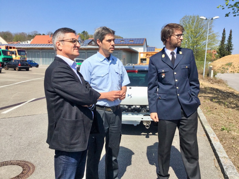 Besuch in der Feuerwehrschule in Regensburg, der ältesten Feuerwehrschule in Bayern: Carsten Liedl vom Bayerischen Innenministerium und stellvertretender Schulleiter Alexander Schröder schildern MdL Alexander Muthmann die geplanten Baumaßnahmen auf dem Übungsgelände (von rechts).