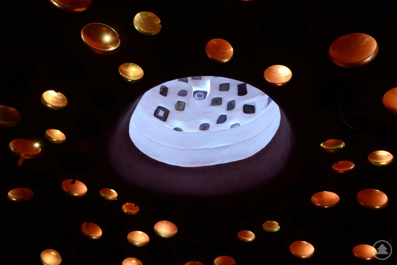 Dann wurden sie mit der Rakubrandtechnik gebrannt. Nach dem Brennen wurden sie in Sägespänen gewälzt, was wunderbare Schattierungen in verschiedenen Farben ergab. Die Lampen wurden später in die Decken der Lehmhäuser eingemauert.