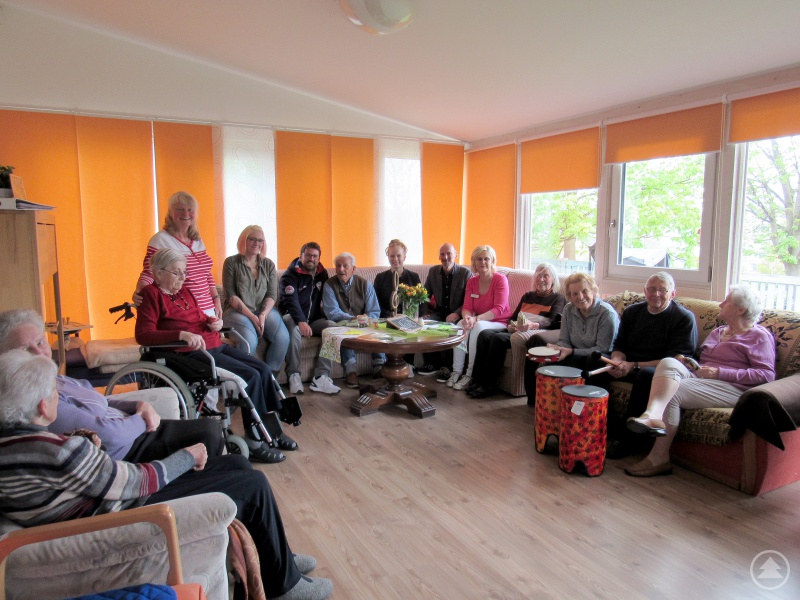Die Bewohner beim Musizieren mit der Betreuungskraft Susanne Büchner (4. v.li.) im Anschluss Präsenzkraft Verena Freund, Geschäftsführer AWO Andreas Lettenmaier mit Natalie Walter (8. v.li.) und Horst Kuffner, beide LRA Regen sowie der Pflegedienstleitung Brigitta Timm.