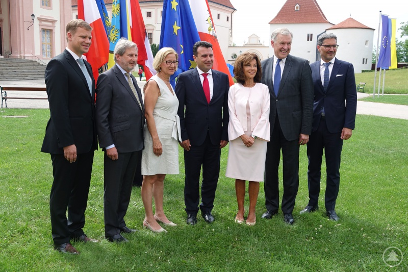 Wollen Europa fit für die Zukunft machen: Von links Bezirkstagspräsident Dr. Olaf Heinrich, EU-Kommissar Johannes Hahn, die niederösterreichische Landeshauptfrau Johanna Mikl-Leitner, der Ministerpräsident von Nordmazedonien Zoran Zaev, Bundeskanzlerin Brigitte Bierlein, Landesrat Martin Eichtinger und Landeshauptmann Südtirol Arno Kompatscher beim Europagipfel auf Stift Göttweig in der Wachau.
