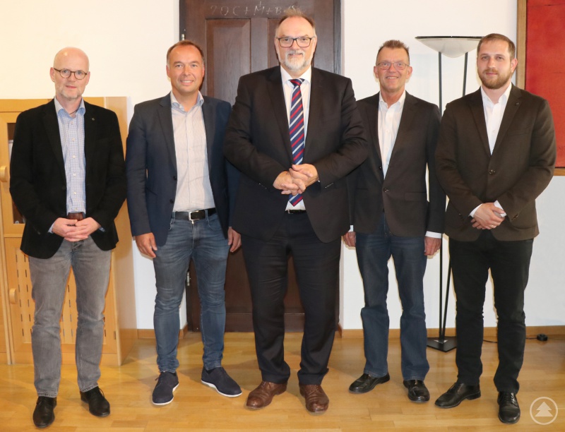 Austausch über die Baubranche: Oberbürgermeister Jürgen Dupper (Mitte) und Baureferent Wolfgang Seiderer (links) mit der Korbinian Rank (von rechts), Thomas Auschner und Georg Seidel von der Strabag AG.