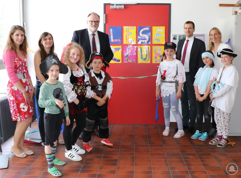 Oberbürgermeister Jürgen Dupper (3. von links) eröffnet mit Rektorin Bettina Stummer (von rechts), Martin Eder vom Lehrstuhl für Schulpädagogik, der Koordinatorin des Leseclubs Isabell Sanftleben und Konrektorin Cosima Tröster-Mehrle den neuen Leseclub. Zuvor haben die Kinder ein passendes Piraten-Musical aufgeführt.