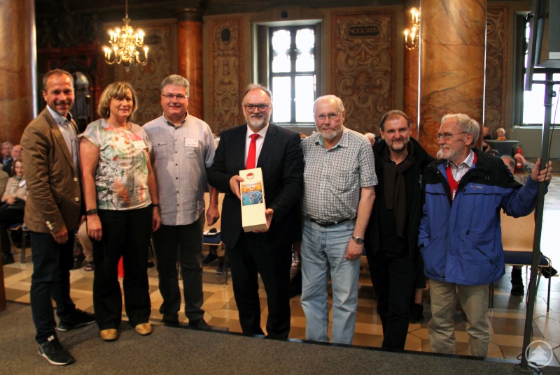Oberbürgermeister Jürgen Dupper (Mitte) freut sich gemeinsam mit (von links) Peter Husty (Vorsitzender der österr. Sonnenuhrenfreunde GSA) Monika Lübker und Peter Lindner (Vorsitzende des Fachkreises Sonnenuhren in der DGC - Deutsche Gesellschaft für Chronometrie), Reinhart Sitter (Tagungsorganisator) und Josef Stadl, (Präsident der DGC) sowie Gottfried Gerstbach (Vors. des Astron. Vereins Österreich) über den Besuch.