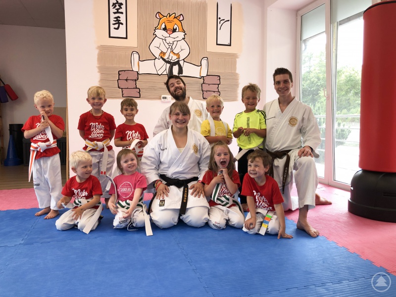 Da fragt man sich, was soll ein Bericht über Gürtelprüfungen bei Dreijährigen? „Was macht ihr denn mit einem 3jährigen in Karate“, werden wir oft gefragt, erzählt die Karatelehrerin Ramona Gruber, „die können doch keine Bretter zerschlagen oder Wände hochlaufen?“ Das müssen sie auch nicht. In der Gruppe der Mini-Tiger, so heißen die Drei- und Vierjährigen im Fachjargon, geht es darum, sie altersangepasst zu fördern und zu fordern. So stehen im Unterrichtsprogramm viele Punkte auf dem Plan, die auch für manche Erwachsene noch schwierig genug zu erlernen sind. Da wird zum Beispiel das Zusammenspiel von Auge, Hand und Fuß gelernt und geübt und die Koordination mithilfe von einfachen Karatebewegungen geschult. Es steht das Erlernen und Üben von grundmotorischen Fähigkeiten, wie Laufen, Hüpfen, Krabbeln, Rollen, Werfen und Fangen im Unterrichtsplan. Und die Eltern der Mini-Tiger wünschen sich, dass die Kleinen ihre sozialen Kompetenzen verbessern. Und zu guter Letzt werden natürlich mit den ersten Karate-Grundtechniken auch die für die Sportart spezifischen Fähigkeiten wie Kicken oder Blocken gelehrt. All das ist dann auch Inhalt der Gürtelprüfung.