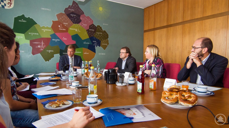 Bei einer Pressekonferenz stellte Bezirkstagspräsident Dr. Olaf Heinrich (Mitte) das Konzept der Pflegeberatung vor. Im Bild (v. r.): Stefan Singer, stv. Leiter des Referats für Bauangelegenheiten, Pflegeberaterin Nicole Bayer und Hermann Baier, stv. Leiter der Sozialverwaltung