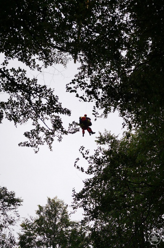 Luftretter und Notarzt winchten sich nahe an der Einsatzstelle ab, was durch die hohen Bäume und den schmalen Weg vom Piloten höchste Konzentration und ganz exaktes Arbeiten erforderte.
