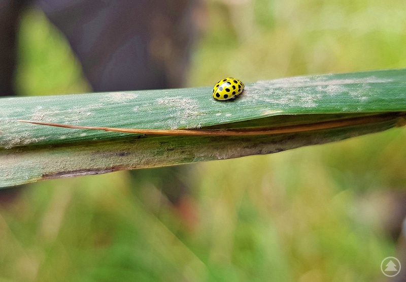 Typische Kleinpilzarten, die als Parasiten auf Pflanzen wachsen, sind Echte Mehltaue. Hier werden dessen kleine Fruchtkörper von einem auf Mehltau spezialisierten 22-Punkt-Marienkäfer gefressen.