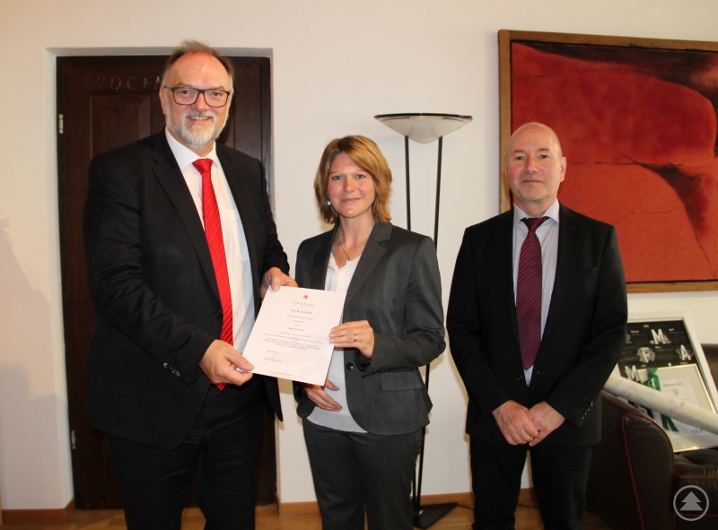 Mit Marina Probst hat die Stadt Passau eine neue behördliche Datenschutzbeauftragte. Bei einem Termin im Amtszimmer händigte Oberbürgermeister Jürgen Dupper der seit 2018 bei der Stadt beschäftigten Volljuristin im Beisein von Herbert Zillinger, Bereichsleiter Personal und Liegenschaften, die Urkunde für die Benennung aus.