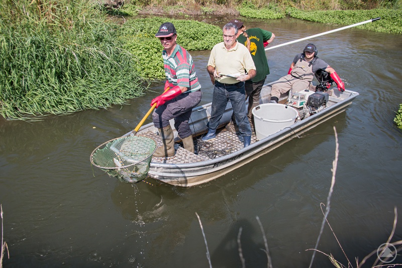 Obwohl die Renaturierung erst vor wenigen Jahren durchgeführt wurde, bietet sich dem Bezirkskämmerer ein Bild, das ganz anders ist als das vieler anderer heimischer, meist begradigter Fließgewässer: Das Flüsschen ist verschlungen, mal schmal und mal breit, hat kleine Inseln, die von Bewuchs bedeckt sind. Es liegt viel Totholz im Wasser und verschiedene Schilfarten haben sich angesiedelt. Nach einer kurzen Vorbesprechung und Arbeitseinteilung geht es mit dem Boot der Fischereifachberatung ins Wasser. Thomas Klaus hat sich bereit erklärt, Protokoll zu führen, also auf Zuruf seiner heutigen Kollegen Art und Größe jedes gefangenen Fischs schriftlich zu erfassen.