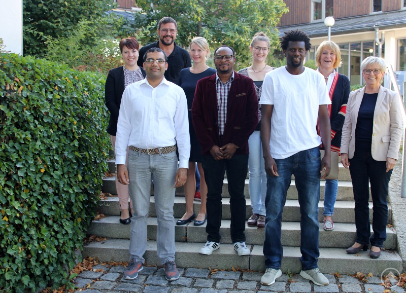Endurance Enoma, Yasir Iqbal und El Hadji Ablaye Ndongo mit Landrätin Rita Röhrl und Dr. Stefanie Duarte Fernandes (Abteilungsleiterin am Landratsamt) und Simone Kasberger (Leiterin des Ausländeramtes), die Bildungskoordinatorin Kristina Beckermann, den Rehau-Ausbildungsleiter Roland Wiesinger sowie die ehrenamtliche Betreuerin Marianne Burgis.
