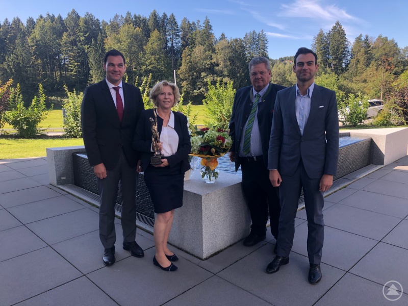 Gratulation zum “Großen Preis des Mittelstandes“: Landrat Sebastian Gruber (li.) und Bürgermeister Max Niedermeier (2. von re.) gratulierten der geschäftsführenden Gesellschafterin Gabriela Römer und Marketingleiter Dr. Korbinian Gruber.