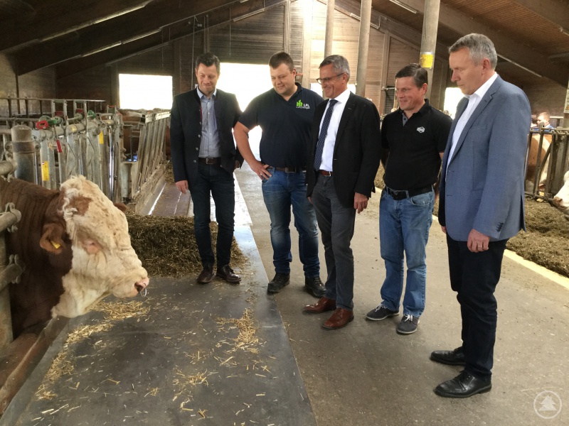 Bulle Harry ist in jeder Hinsicht ein Schwergewicht. Davon überzeugten sich MdL Christoph Skutella, Christian Ofenbeck, Fachberater für Rinderhaltung, MdL Alexander Muthmann, Matthias Lippl, Fachbereichsleiter für Schweinehaltung, und Helmut Konrad, Chef des LVFZ Almesbach, der vorübergehend auch für Kringell zuständig ist.