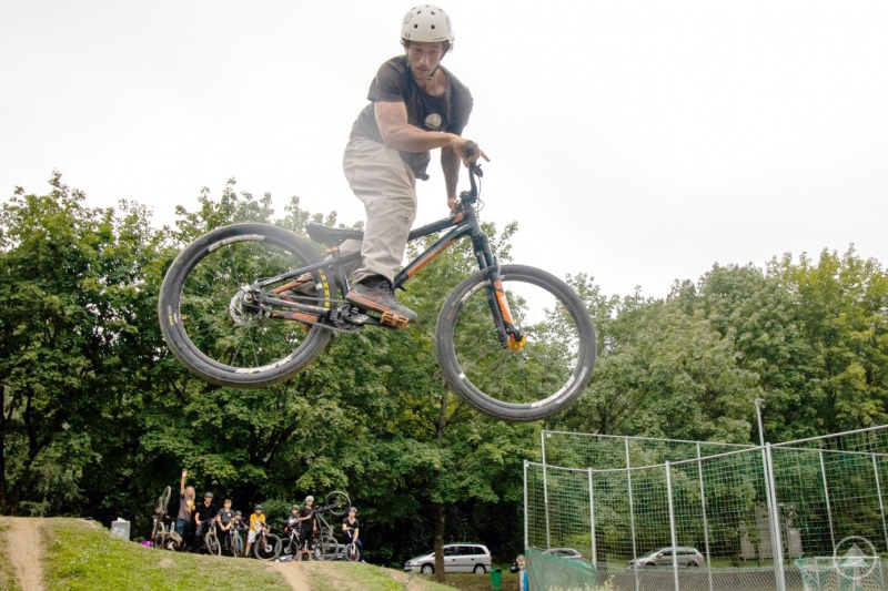 Erst danach geht es in die Dirt-Bike-Line, wo Sprünge bis zu einer Höhe von zwei Metern und höher möglich sind. Kaliczewsky gab dabei nicht nur eine beeindruckende Demonstration seines Repertoires, sondern leitete jeden einzelnen Teilnehmer auch beim Nachmachen an. Die Präparierung der „Lines“, also der Bahnen, wurde von der Gruppe selbst übernommen. Werkzeug sowie Lehm und Erde wurden vom städtischen Bauhof zur Verfügung gestellt, der ohnehin regelmäßig für eine optimale Nutzung des 2011 von der Stadt Passau eingerichteten Dirt-Bike-Parks in der Westerburgerstraße sorgt. Dieser erfreut sich immer größerer Beliebtheit und zieht mehr und mehr Biker an.