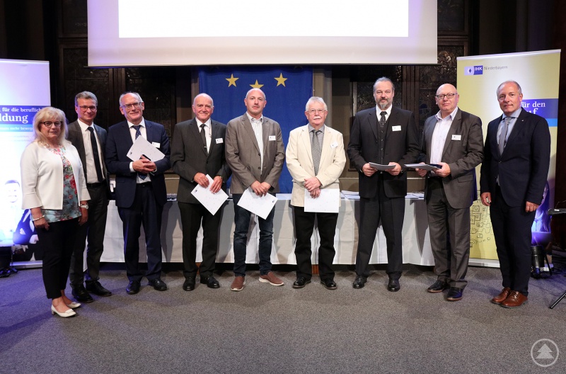 80.000 Stunden ehrenamtlicher Einsatz für etwa 8.800 Ausbildungsprüfungen, 2.400 Fortbildungsprüfungen und 500 Fach- und Sachkundeprüfungen – diese beeindruckenden Zahlen für das vergangene Jahr belegen den große Engagement der über 3.500 ehrenamtlichen Prüfer der IHK Niederbayern im Bereich der beruflichen Aus- und Weiterbildung. 201 besonders verdiente Persönlichkeiten aus diesem Kreis haben am Montag bei einer Veranstaltung in Passau eine Auszeichnung für diese außergewöhnlichen Leistungen erhalten, unter ihnen sieben Prüfer aus dem Landkreis Freyung-Grafenau. IHK-Präsident Thomas Leebmann und Bayerns Wissenschaftsminister Bernd Sibler zeichneten sie mit Ehrennadeln und Ehrenplaketten der IHK aus.