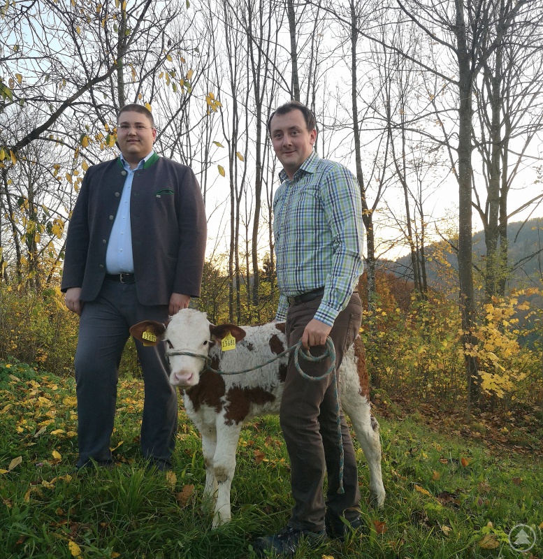 JU-Kreisvorsitzender Christoph Weishäupl (links) und stellv. JU-Ortsvorsitzender (Freyung) Ludwig König (rechts) mit Kalb Lisa am heimischen Hof der Familie König.