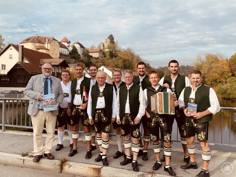 Oberbürgermeister Jürgen Dupper (links) wünscht den „Andorfer Plattlern“ gute Reise.