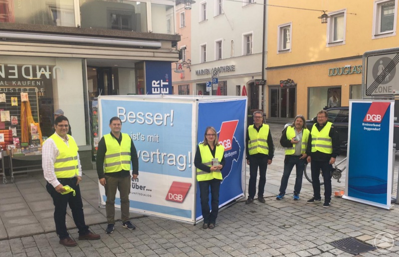 Was hat ein Tarifvertrag mit dem Weihnachts- oder Urlaubsgeld zu tun? Diese und andere Fragen rund um das Thema Tarifvertrag beantworteten Gewerkschafter des DGB-Kreisverbandes Deggendorf mit ihrem Vorsitzenden Thomas Müller auf dem Deggendorfer Stadtplatz den Menschen vor Ort direkt.