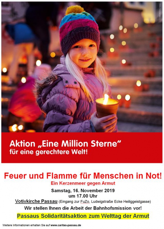 „Wie arm ist Passau?“ Diese Frage stellt die Caritas am Samstag, 16. November. Mit der Aktion „Eine Million Sterne“ wird auf Menschen in Not in Stadt und Landkreis aufmerksam gemacht. Ab 17.00 Uhr werden am neuen Standort der Aktion an der Votivkirche, Beginn der Fußgängerzone, Lichter der Solidarität aufgestellt.