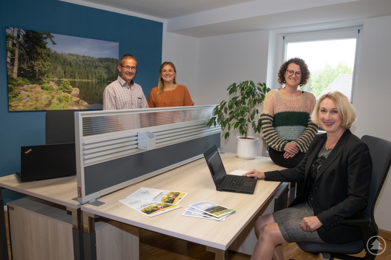 Testen den neuen Coworking Space in Spiegelau (v. r. n. l.): Campusleitung Prof. Dr. Diane Ahrens, Leiterin des KuBiS Spiegelau Julia Gangkofner, Hanna Schürzinger und Rainer Bomeisl vom TC Grafenau