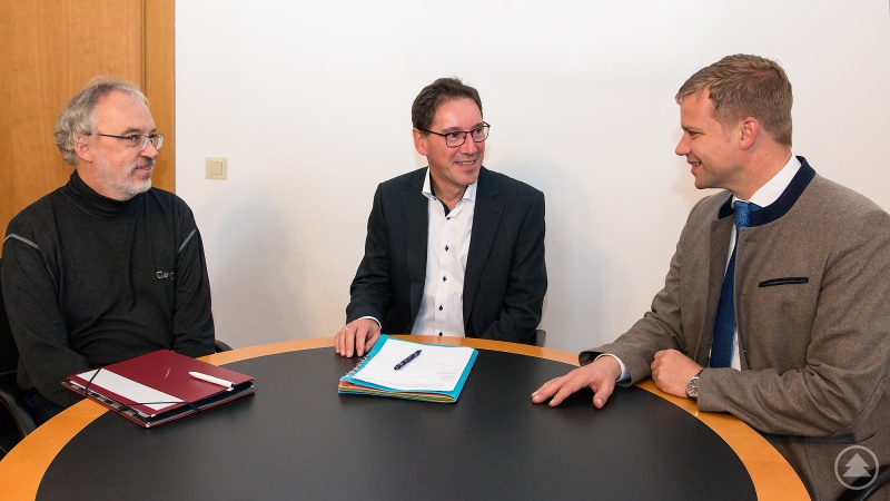 Die Vorstandmitglieder der Arbeitsgemeinschaft Behindertenhilfe Niederbayern Peter Weiß (li), Geschäftsführer Sozialteam, und Thomas Hochbrückl, Geschäftsführer der Lebenshilfe Passau, im Gespräch mit Bezirkstagspräsident Dr. Olaf Heinrich (re.)