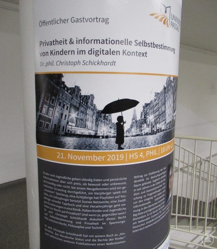 Haben Kinder und Jugendliche bei der Preisgabe persönlicher Informationen ein Recht auf Privatheit? Und wenn ja, gegenüber wem? Ist ein Mikrosender unter der Haut eines Kindes der beste Schutz gegen Entführungen? Im Vortrag von Dr. phil. Christoph Schickhardt, unter dem Titel „Privatheit & informationelle Selbstbestimmung von Kindern im digitalen Kontext“, sollten genau diese Fragen besprochen und geklärt werden.