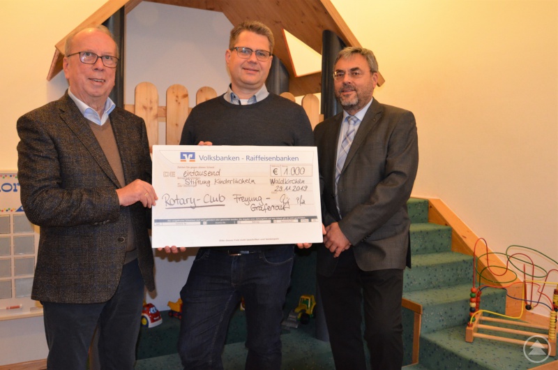 Mit seinen 34 Mitgliedern ist der Rotary-Club Freyung-Grafenau nicht sonderlich groß, dennoch umso rühriger. „Wir unterstützen seit jeher soziale Einrichtungen in der Region und so wollen wir auch dieses Jahr einen Teil unserer Mitgliedsbeiträge spenden“, erklärt Alois Atzinger, Präsident des Rotary-Club Freyung-Grafenau bei einer kleinen Spendenübergabe in Waldkirchen. Gemeinsam mit Rotary-Kollege Dr. Peter Seidl, Kinder- und Jugendarzt in Waldkirchen, hat der Präsident den Spendenscheck über 1.000 Euro an Prof. Dr. Matthias Keller, Chefarzt der Kinderklinik Dritter Orden Passau und Stiftungsratsmitglied, übergeben – verbunden mit dem Zusatz: „Die Kinderklinik in Passau ist für Familien aus der gesamten Region von Bedeutung, deswegen ist es uns ein Anliegen, die Arbeit dort mit einer Spende an die Stiftung zu unterstützen“, so Atzinger.