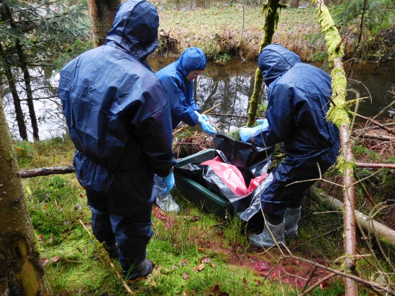 Im Übungsszenario war einer der „Kadaver“ im abschüssigen Gelände abgelegt, um die Bergung bei erschwertem Zugang direkt am Bach zu üben. Auch die weiteren Schritte wie Ort Beprobung, Verpackung in den Leichensack und Abtransport der „Kadaver“ wurden direkt vor Ort durchgeführt.