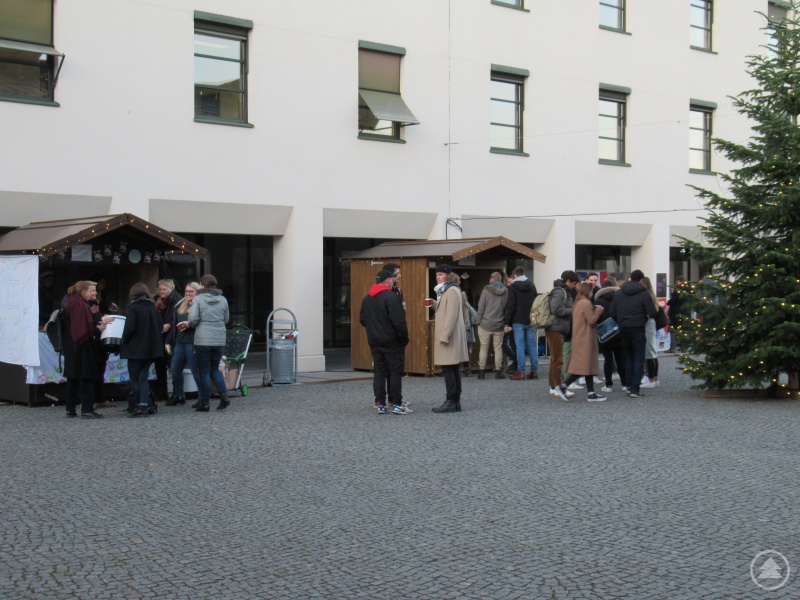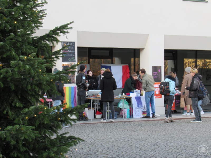 Um die beiden Häuschen herum standen zahlreiche Tische, hinter denen ein Großteil der Hochschulgruppen der Universität Passau die Möglichkeit hatte, am Charity-Weihnachtsmarkt teilzunehmen. Dieses Angebot wurde auch sehr gut angenommen.